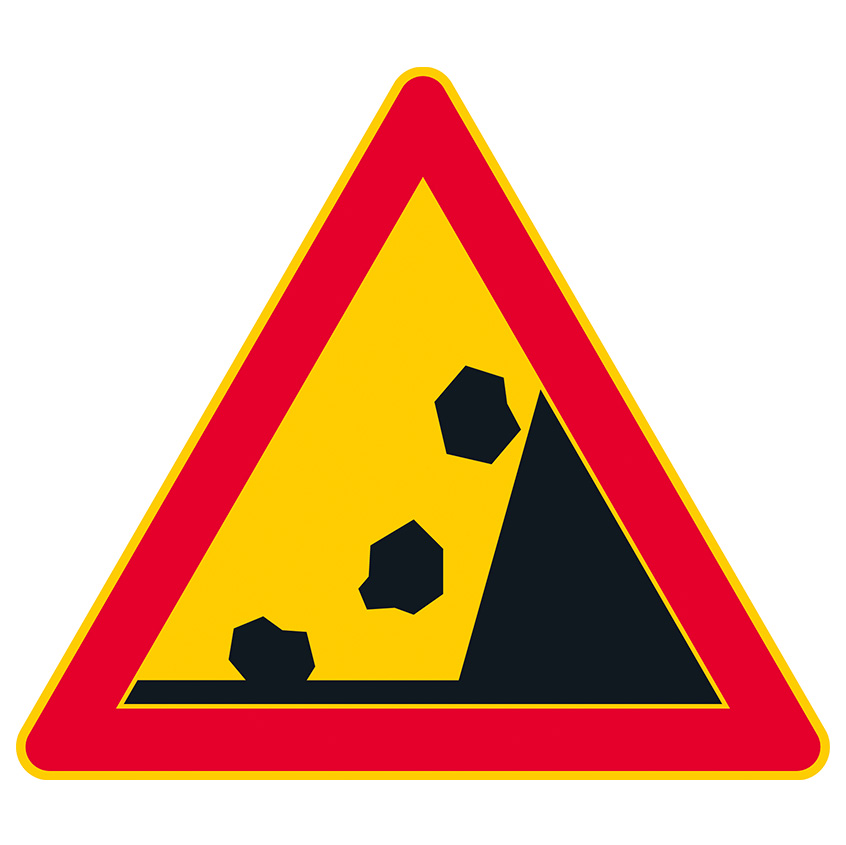 CE-hyväksytty varoitusmerkki A30 (181) putoavia kiviä. Alumiininen liikennemerkki R2 tai R1 kalvolla. Merkki on punakeltainen ja sivun pituudeltaan 900 mm.