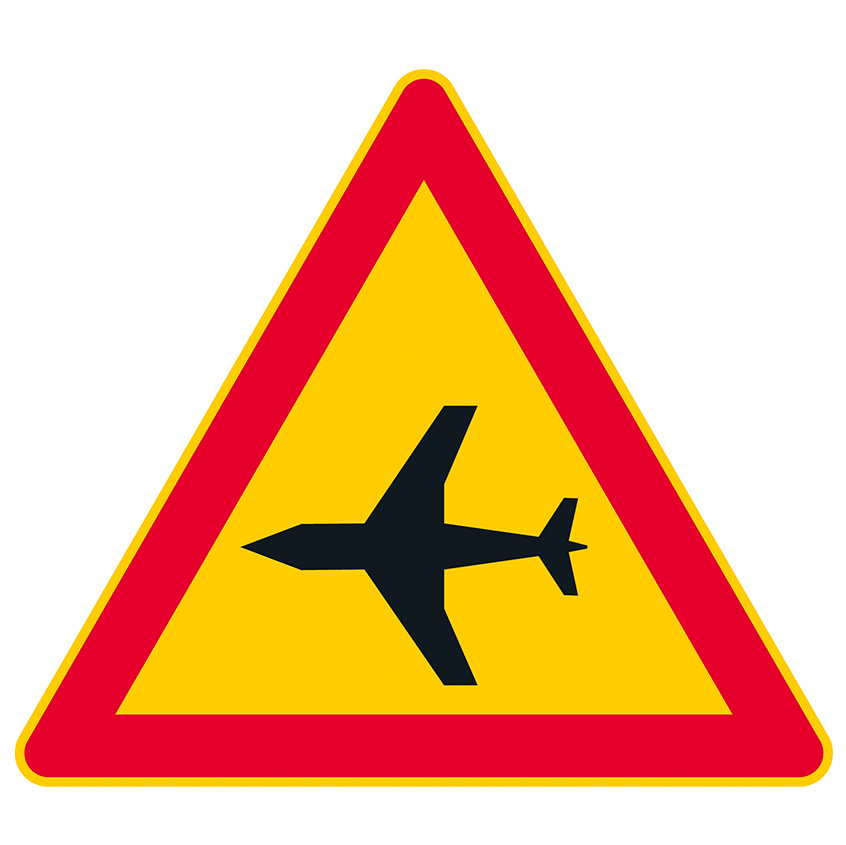 CE-hyväksytty varoitusmerkki A31 (182) matalalla lentäviä lentokoneita. Alumiininen liikennemerkki R2 tai R1 kalvolla. Merkki on punakeltainen ja sivun pituudeltaan 900 mm.