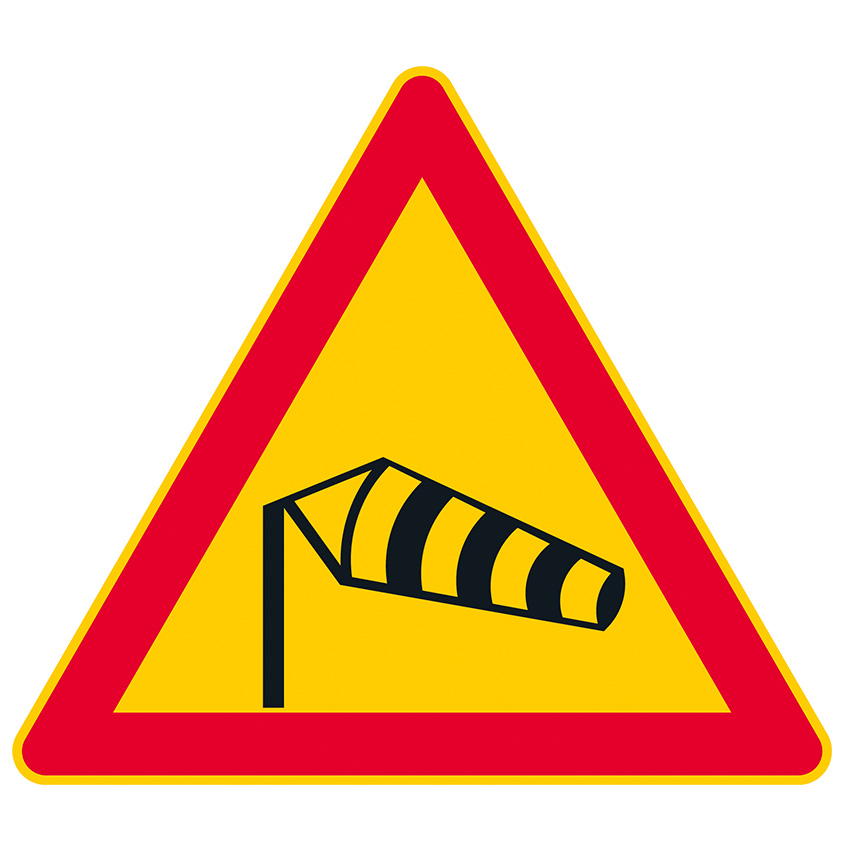 CE-hyväksytty varoitusmerkki A32 (183) sivutuuli. Alumiininen liikennemerkki R2 tai R1 kalvolla. Merkki on punakeltainen ja sivun pituudeltaan 900 mm.