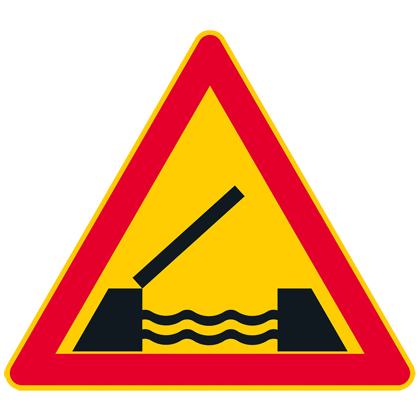 CE-hyväksytty varoitusmerkki A6 (131) avattava silta. Alumiininen liikennemerkki R2 tai R1 kalvolla. Merkki on punakeltainen ja sivun pituudeltaan 900 mm.