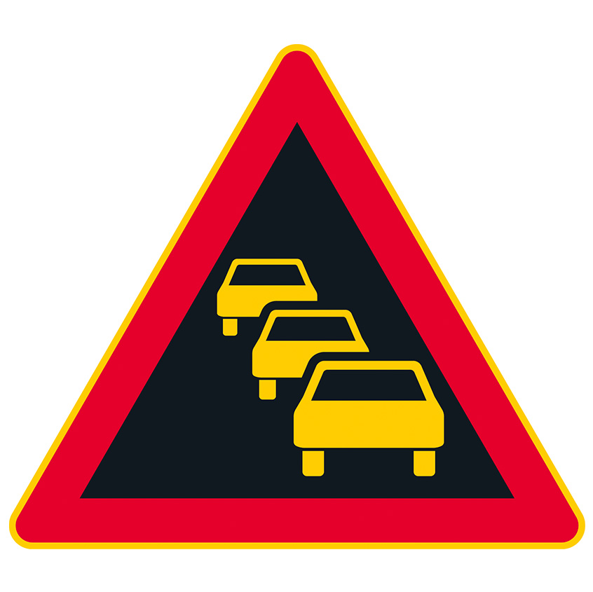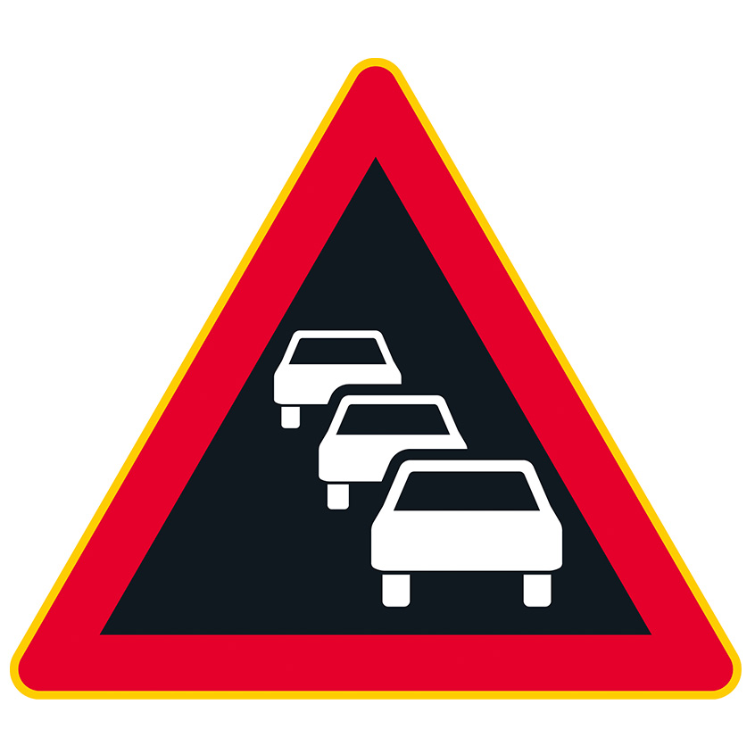 CE-hyväksytty varoitusmerkki A8.2 (133) liikenneruuhka. Alumiininen liikennemerkki R2 tai R1 kalvolla. Merkki on punakeltainen tai punakeltavalkoinen ja sivun pituudeltaan 900 mm.