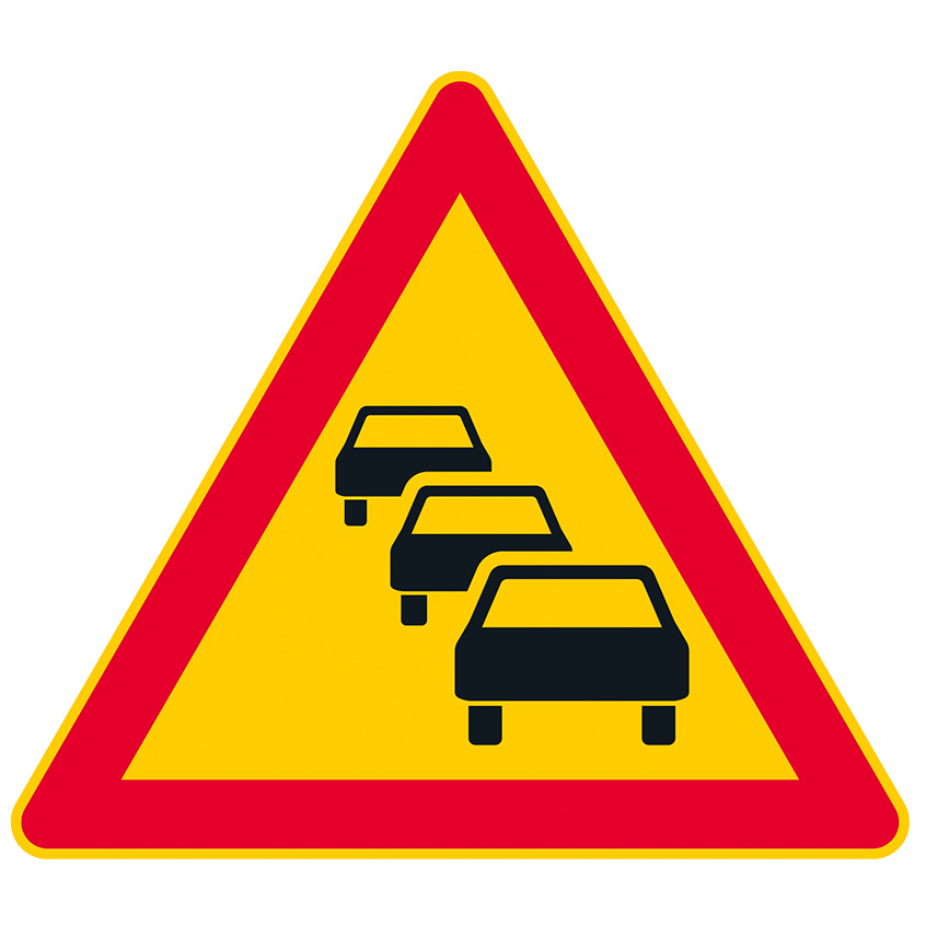 CE-hyväksytty varoitusmerkki A8 (133) liikenneruuhka. Alumiininen liikennemerkki R2 tai R1 kalvolla. Merkki on punakeltainen tai punavalkoinen ja sivun pituudeltaan 900 mm.