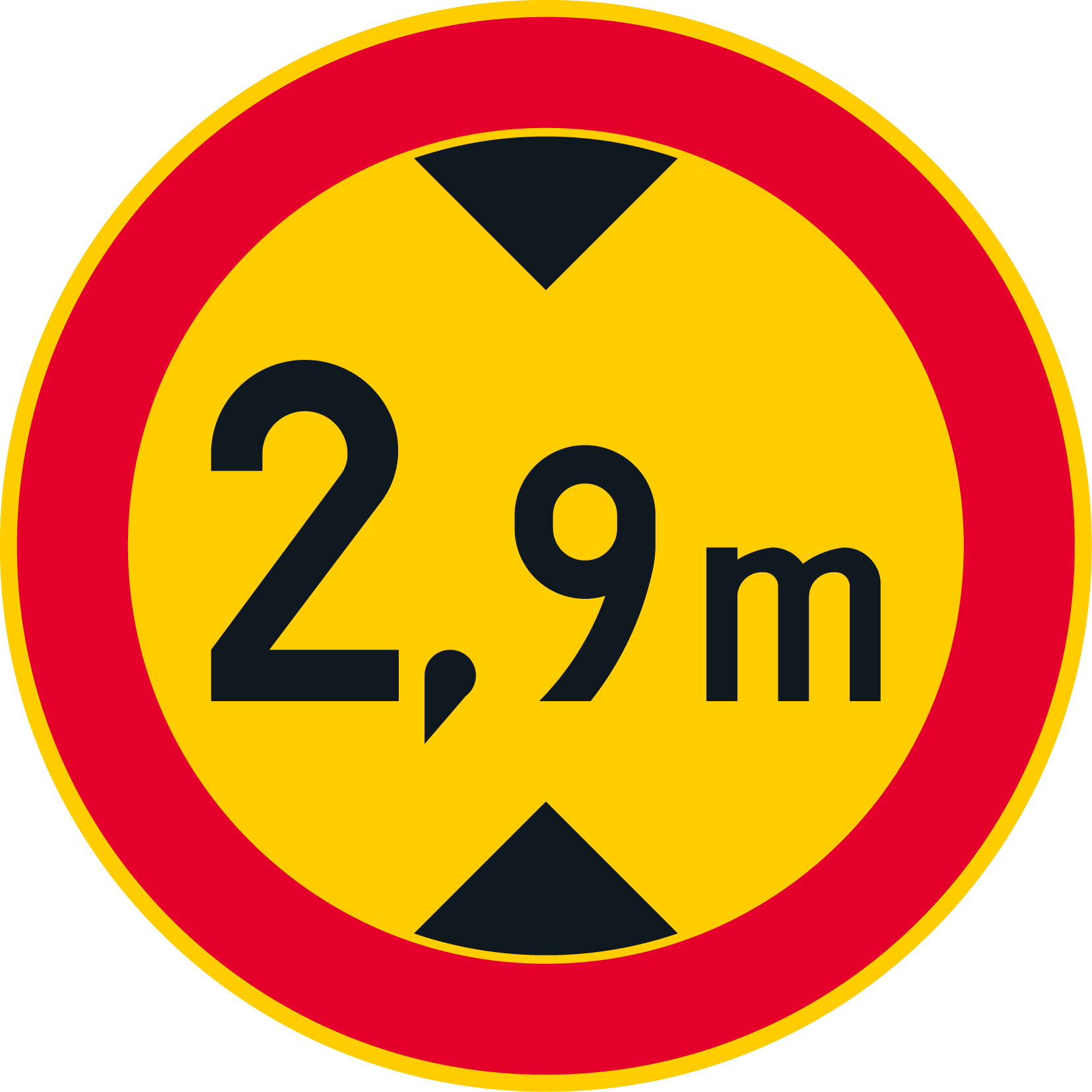 CE-hyväksytty rajoitusmerkki C22.11 (342) ajoneuvon suurin sallittu korkeus – 2,9 m. Alumiininen liikennemerkki R1/R2 kalvolla. Merkki on punakeltainen ja halkaisijaltaan 640 mm.