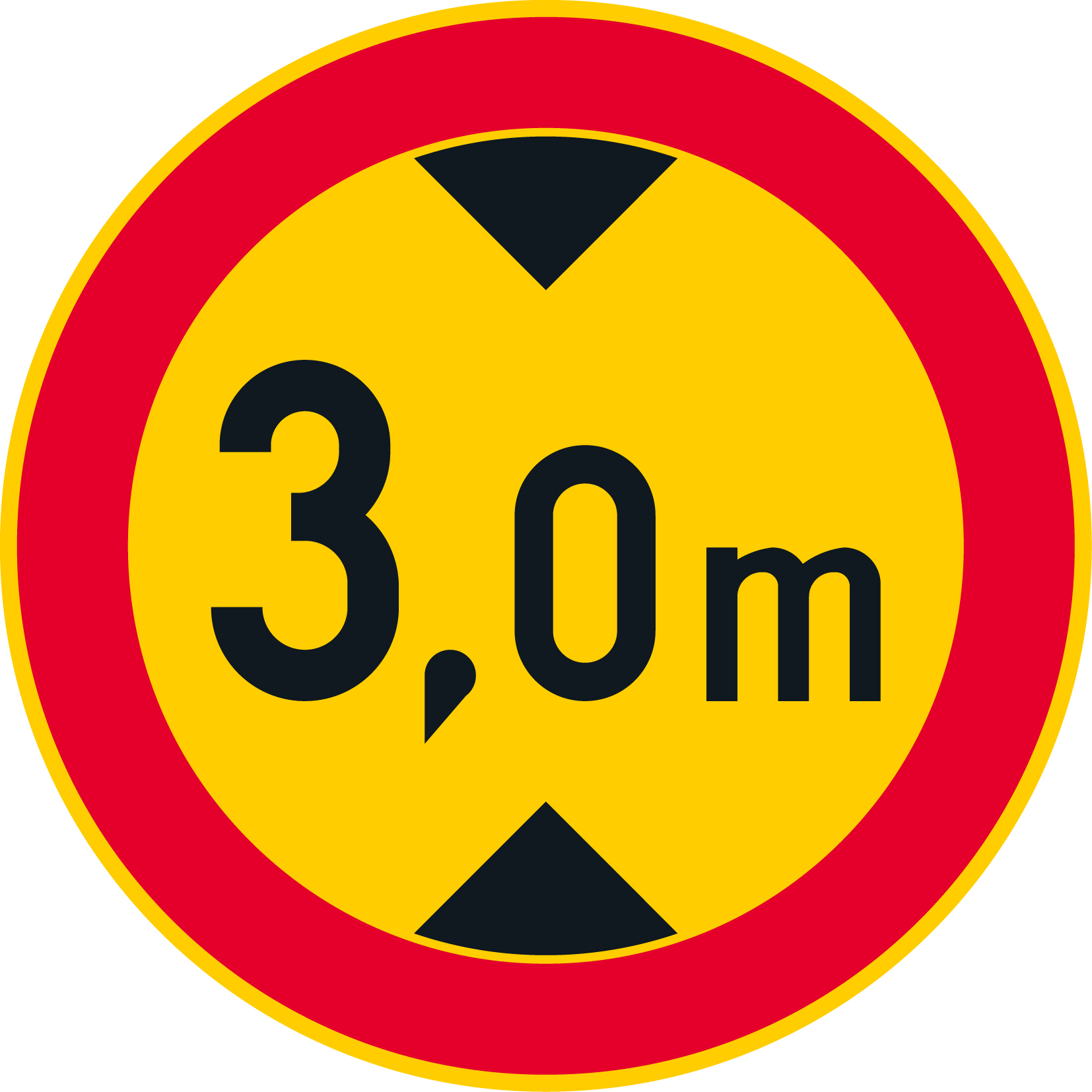 CE-hyväksytty rajoitusmerkki C22.12 (342) ajoneuvon suurin sallittu korkeus – 3,0 m. Alumiininen liikennemerkki R1/R2 kalvolla. Merkki on punakeltainen ja halkaisijaltaan 640 mm.