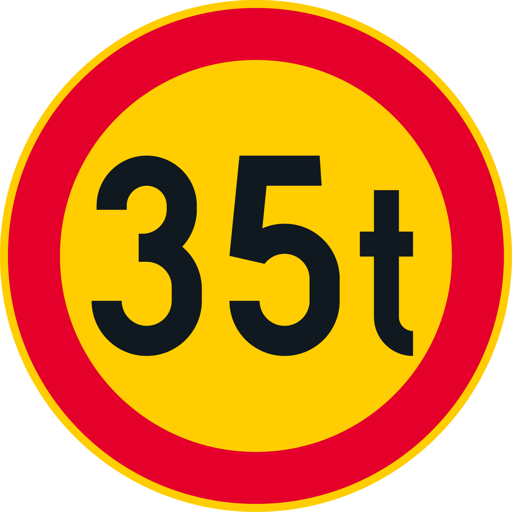 CE-hyväksytty rajoitusmerkki C24.13 (344) ajoneuvon suurin sallittu massa – 35 t. Alumiininen liikennemerkki R1 tai R2 kalvolla. Merkki on punakeltainen ja halkaisijaltaan 640 mm.