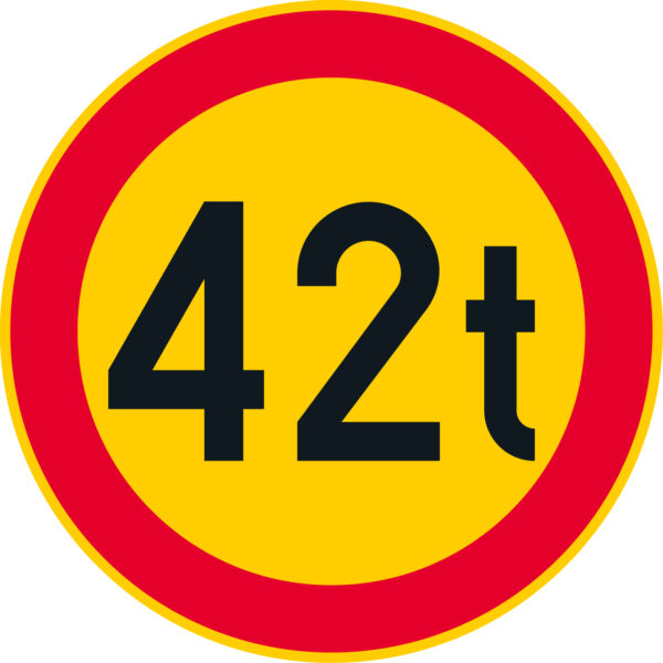 CE-hyväksytty rajoitusmerkki C24.14 (344) ajoneuvon suurin sallittu massa – 42 t. Alumiininen liikennemerkki R1 tai R2 kalvolla. Merkki on punakeltainen ja halkaisijaltaan 640 mm.