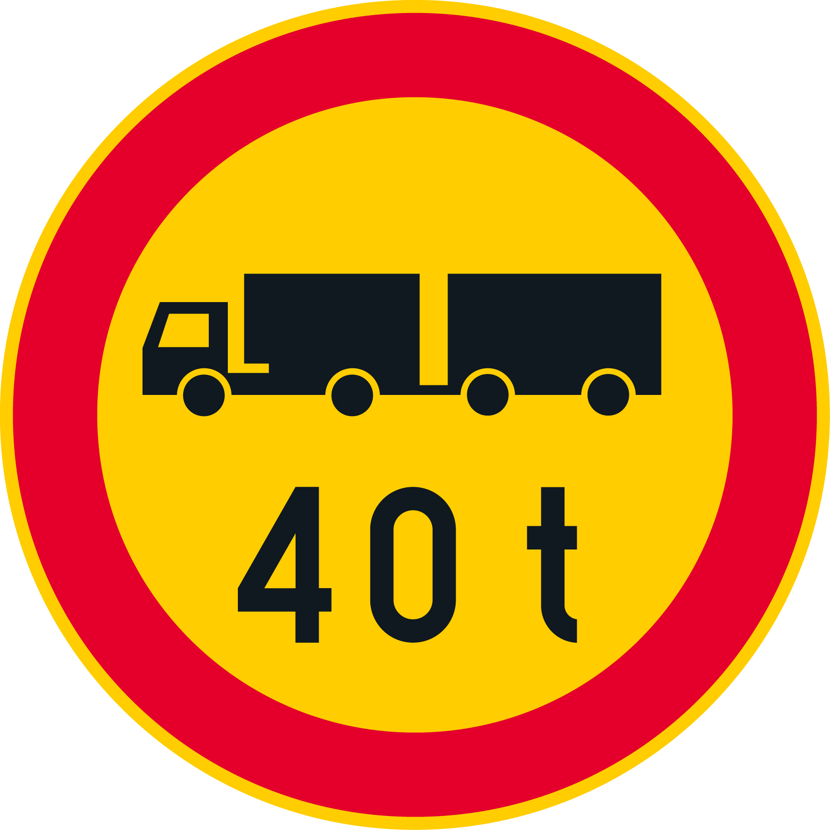 CE-hyväksytty rajoitusmerkki C25.3 (345) ajoneuvoyhdistelmän suurin sallittu massa – 40 t. Alumiininen liikennemerkki R1 tai R2 kalvolla. Merkki on punakeltainen ja halkaisijaltaan 640 mm.