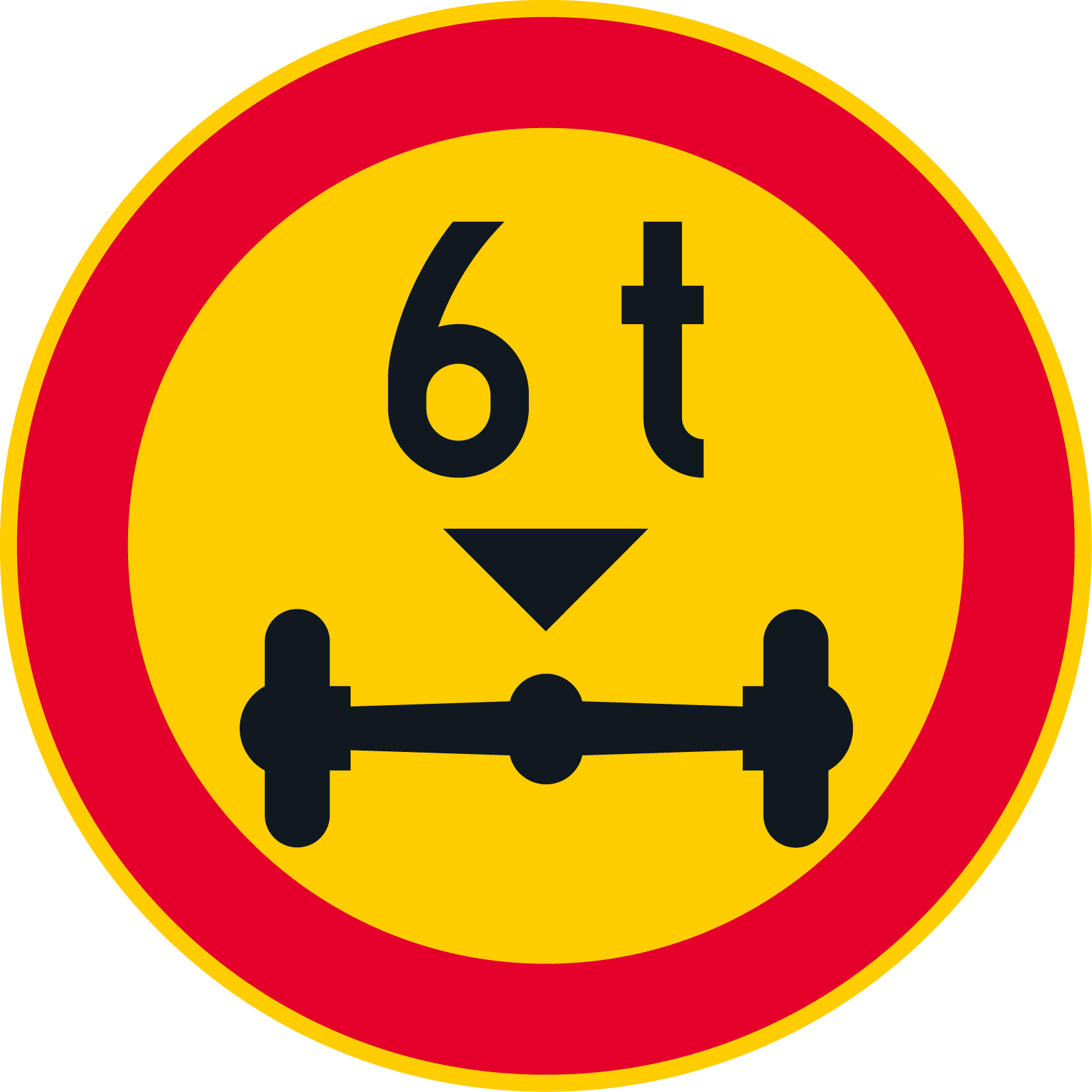 CE-hyväksytty rajoitusmerkki C26.4 (346) ajoneuvon suurin sallittu akselille kohdistuva massa – 6 t. Alumiininen liikennemerkki R1 tai R2 kalvolla. Merkki on punakeltainen ja halkaisijaltaan 640 mm.
