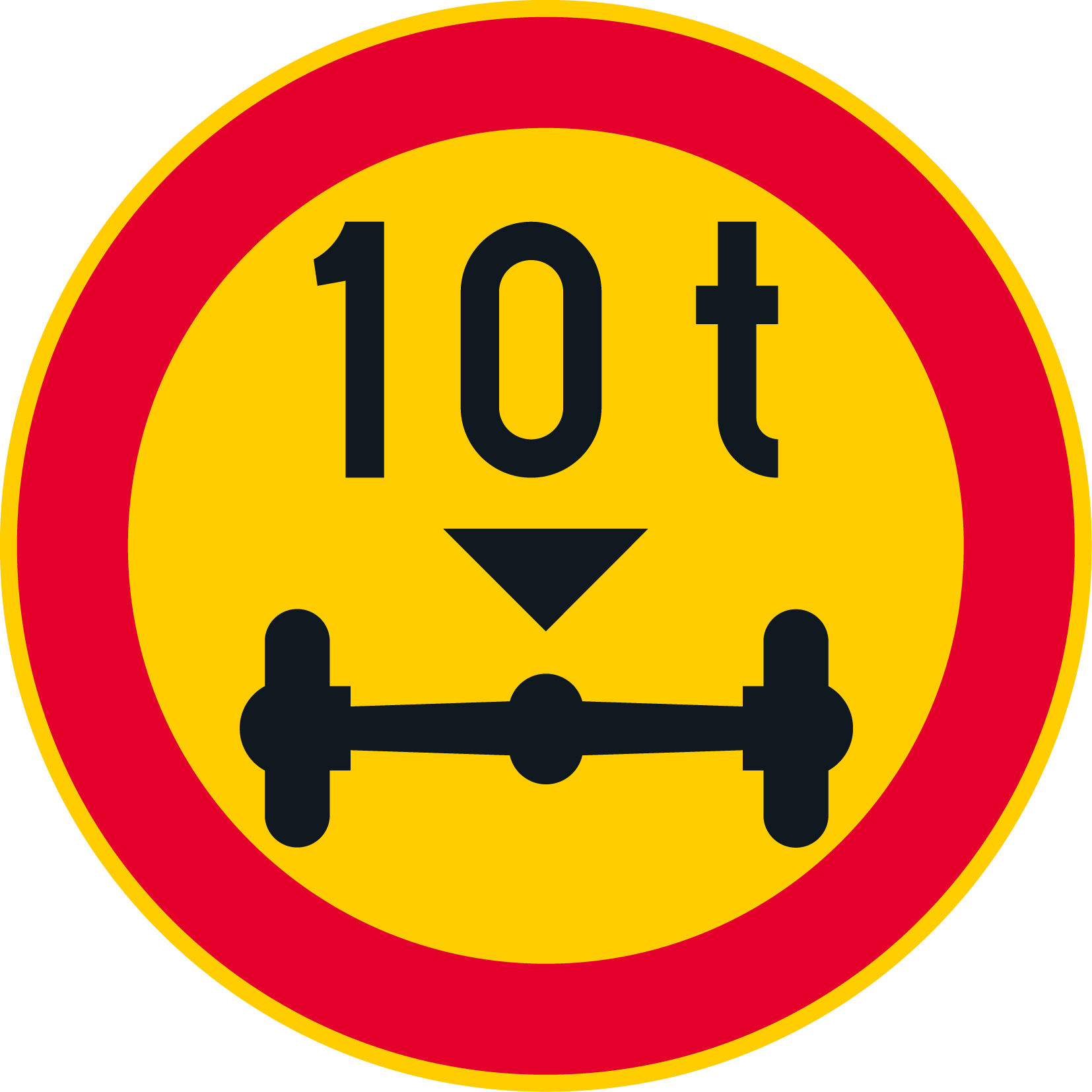 CE-hyväksytty rajoitusmerkki C26.7 (346) ajoneuvon suurin sallittu akselille kohdistuva massa – 10 t. Alumiininen liikennemerkki R1 tai R2 kalvolla. Merkki on punakeltainen ja halkaisijaltaan 640 mm.