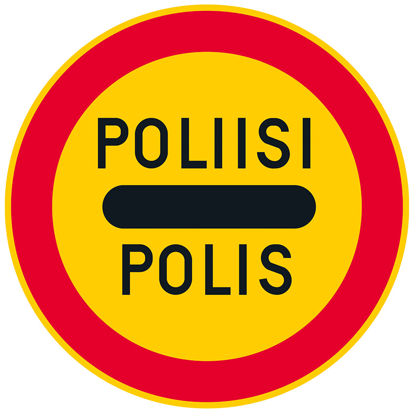 CE-hyväksytty rajoitusmerkki C46 (392) pakollinen pysäyttäminen tarkastusta varten – STOP Poliisi. Alumiininen liikennemerkki R2 kalvolla. Merkki on punakeltainen ja halkaisijaltaan 640 mm.