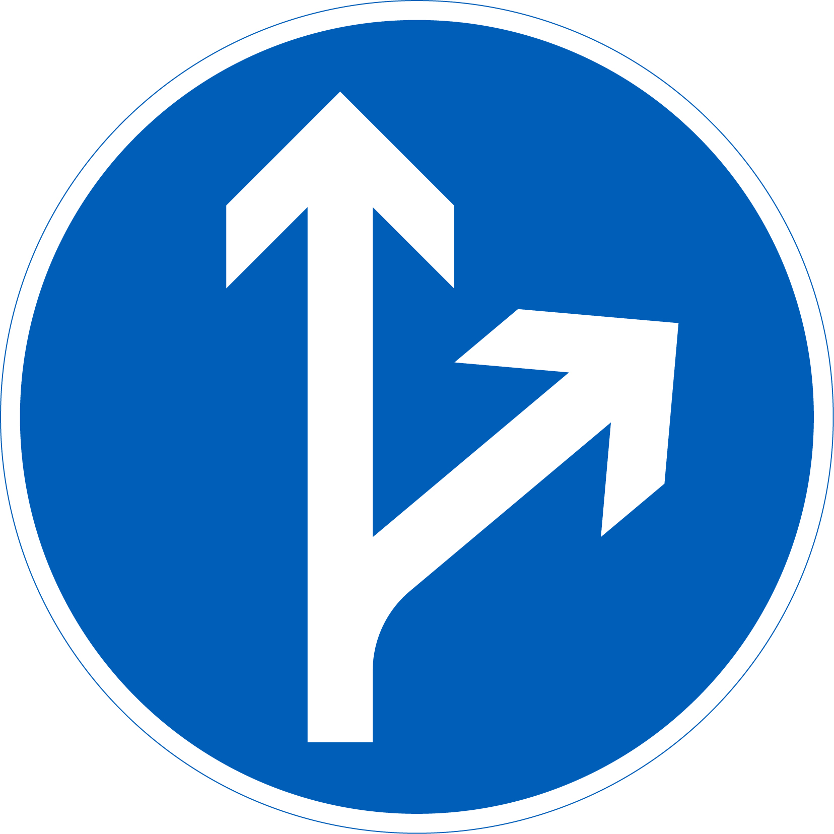 CE-hyväksytty rajoitusmerkki D1.6.2 (414) pakollinen ajosuunta – suora + oikea yläviisto. Liikennemerkki on alumiinia R1 tai R2 kalvolla. Merkki on sinivalkoinen ja halkaisijaltaan 640 mm.