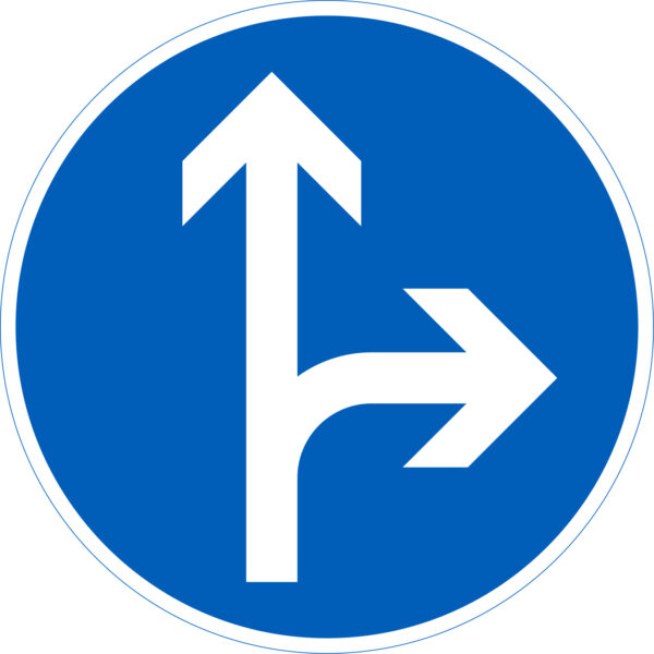 CE-hyväksytty rajoitusmerkki D1.6 (414) pakollinen ajosuunta – suora + mutka oikea. Liikennemerkki on alumiinia R1 tai R2 kalvolla. Merkki on sinivalkoinen ja halkaisijaltaan 640 mm.