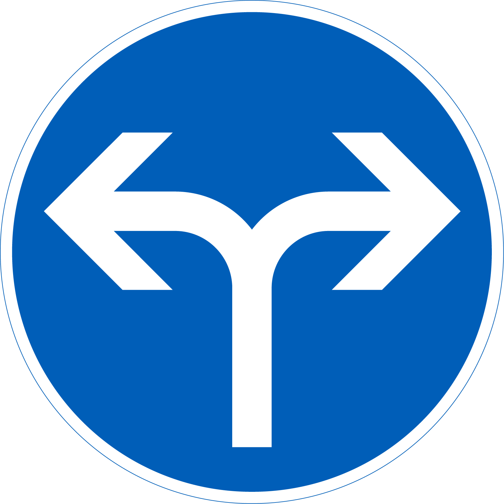 CE-hyväksytty rajoitusmerkki D1.8 (415) pakollinen ajosuunta – mutka oikea + mutka vasen. Liikennemerkki on alumiinia R1 tai R2 kalvolla. Merkki on sinivalkoinen ja halkaisijaltaan 640 mm.