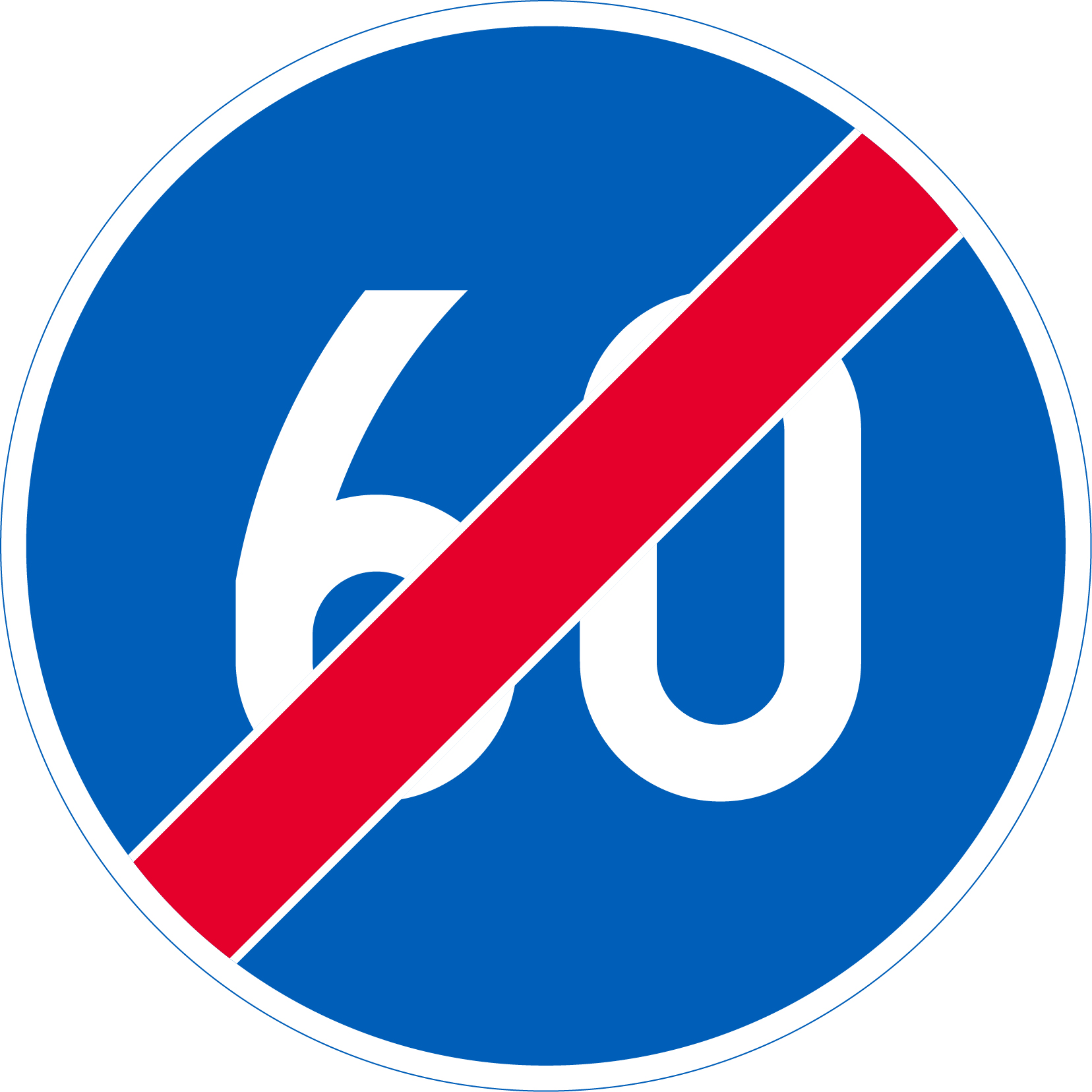 CE-hyväksytty rajoitusmerkki D11.2 vähimmäisnopeus päättyy – 60. Liikennemerkki on alumiinia R1 tai R2 kalvolla. Merkki on sinivalkoinen ja halkaisijaltaan 640 mm.