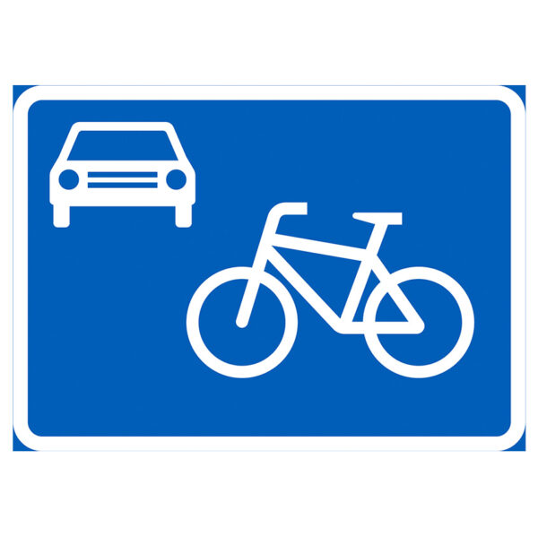 CE-hyväksytty liikennemerkki E28 pyöräkatu. Alumiininen sääntömerkki R1 tai R2 kalvolla. Merkki on sinivalkoinen ja kooltaan 700×500 mm.