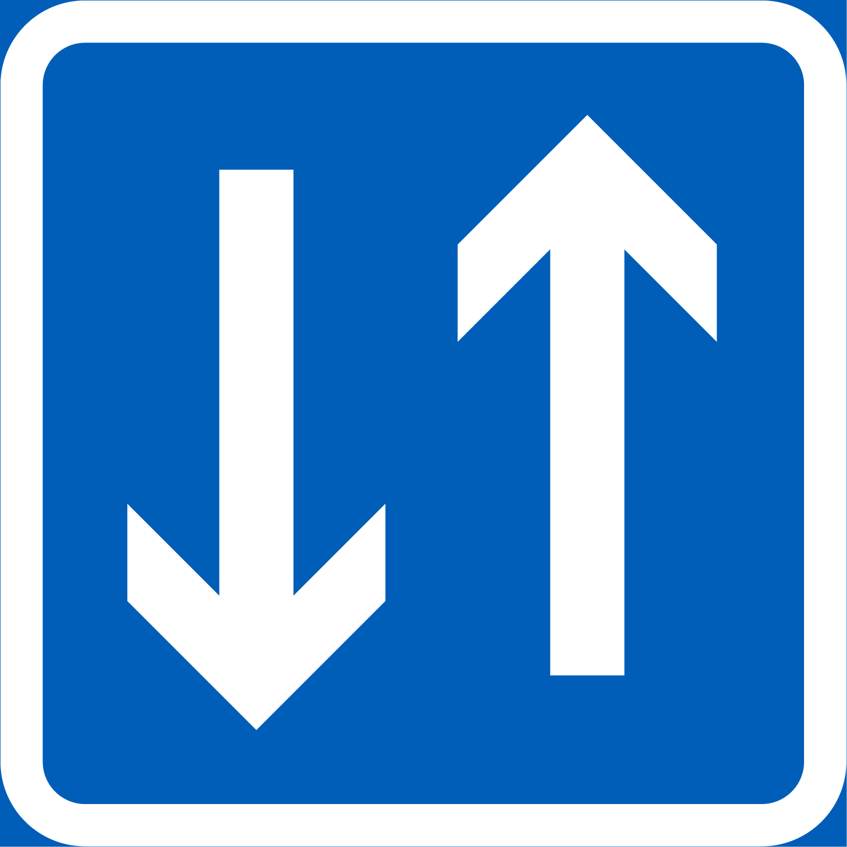 E5 Kohtaamispaikka on alumiininen sääntömerkki R1 kalvolla. Liikennemerkki E5 (522) on sinivalkoinen ja kooltaan 440×400 mm.