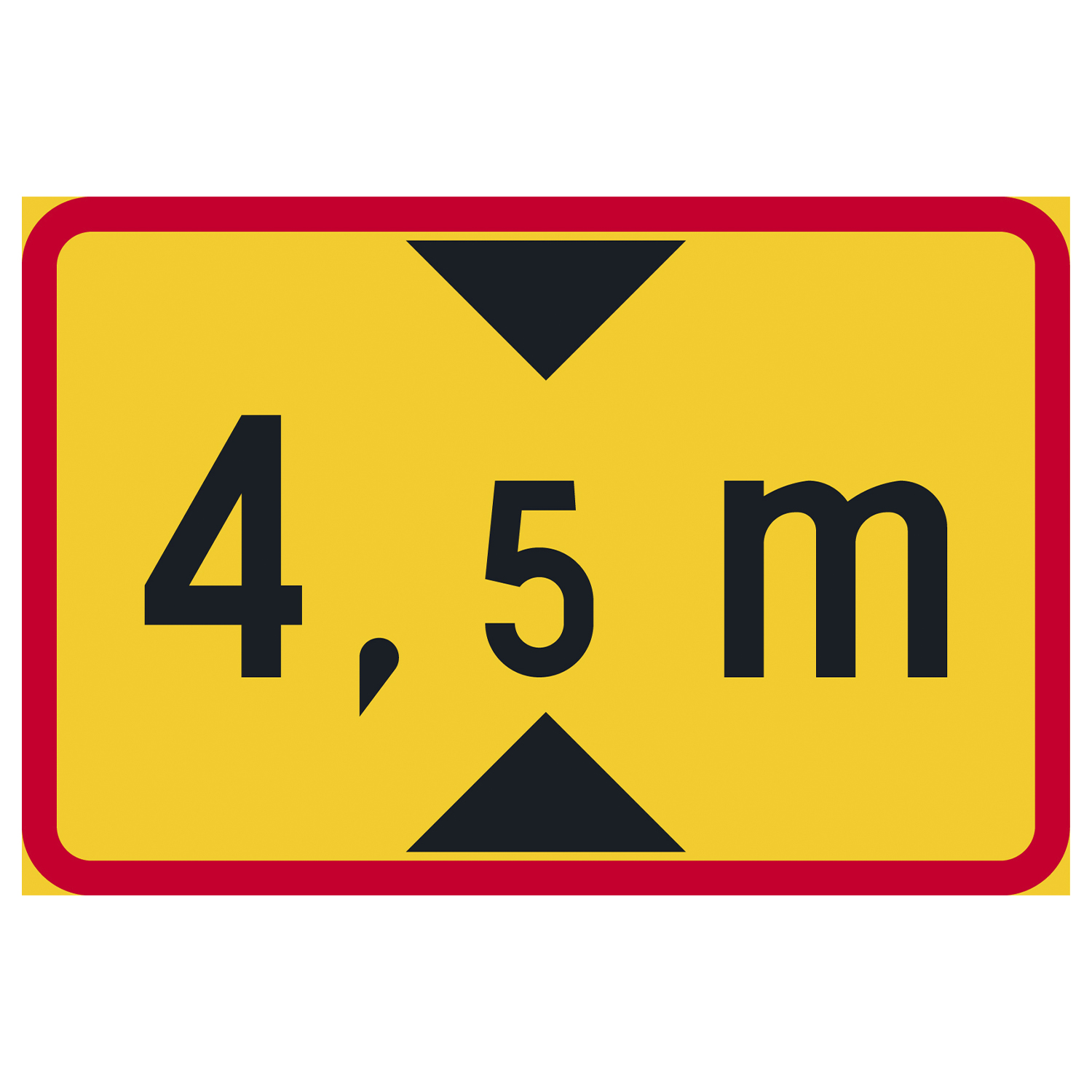 Lisäkilpi H7 vapaa korkeus – ”xx m”. Työnaikainen muovinen liikennemerkki R3FL päiväloistekalvolla tai CE-hyväksytty alumiininen liikennemerkki R1 tai R2 kalvolla. Merkki on punakeltainen ja kooltaan joko 600×300 mm tai 600×400 mm.