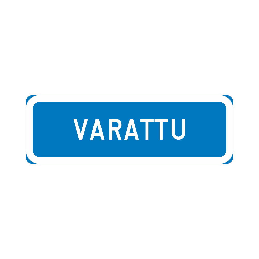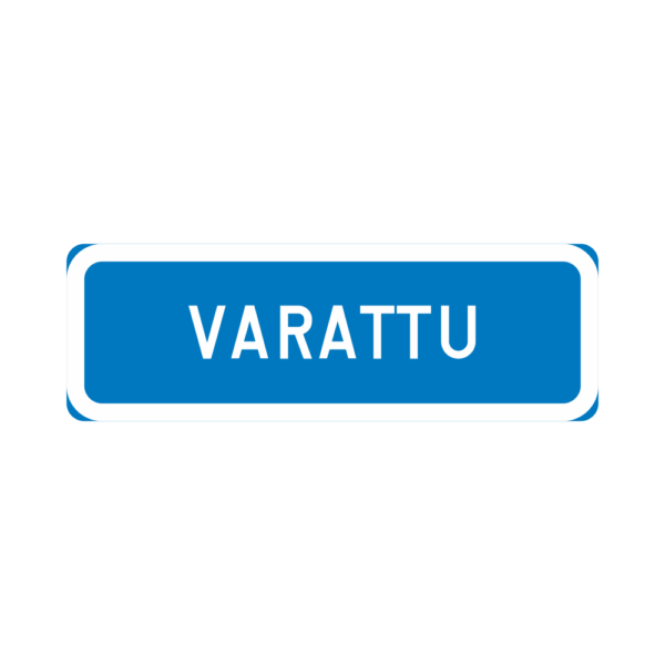 CE-hyväksytty lisäkilpi H24 ”VARATTU”. Liikennemerkki on alumiininen, R1 kalvolla. Merkki on sinivalkoinen ja kooltaan 600×200 mm.