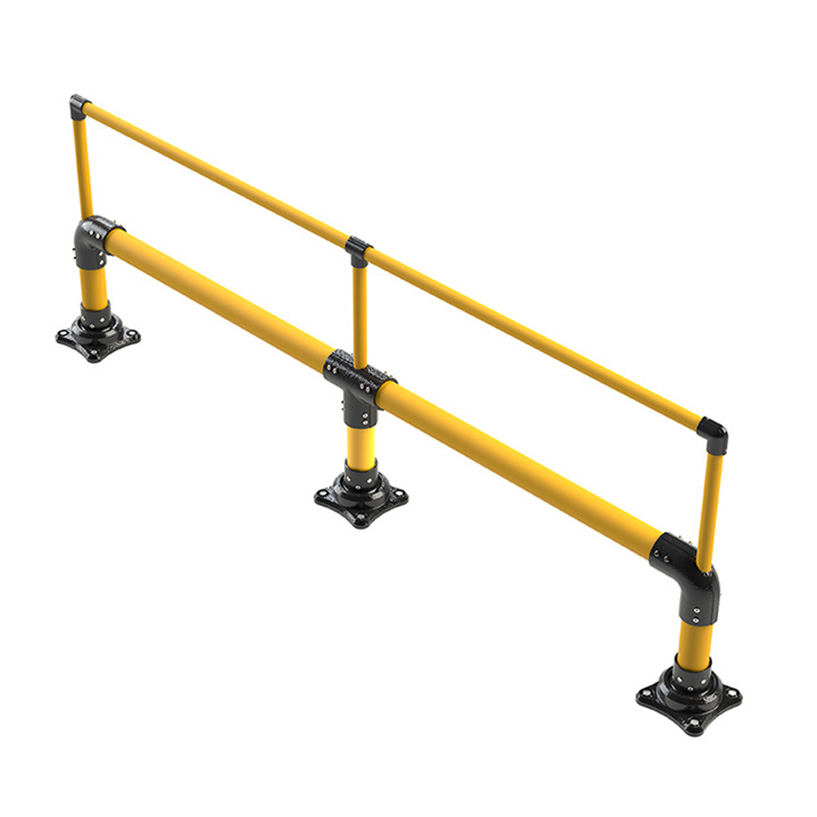SlowStop IronFlex törmäyssuoja-aita käsijohteella kolmella type 2 pollarilla. Tuotekokonaisuus koostuu 3 pollarista, kahdesta L kulmapalasta ja yhdestä T kulmapalasta sekä kahdesta vaakaputkesta sekä käsijohdekokonaisuudesta (kolme kiinnikettä, kaksi vaakaputkea sekä kolme pystyputkea).