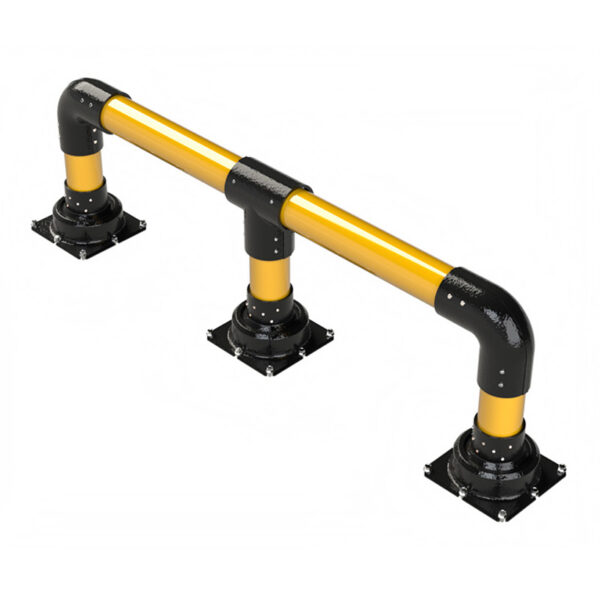 SlowStop IronFlex törmäyssuoja-aita koostuu kolmesta type 3 pollarista, kahdesta L kulmapalasta, yhdestä T kulmapalasta sekä kahdesta vaakaputkesta.
